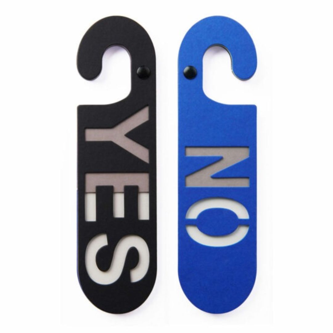 This modern door sign combines bold typography with a clean black and blue colour palette. With a simple flip, you clearly communicate whether it’s a YES or a NO behind the door. The graphic contrast gives it a contemporary look that fits perfectly in home offices, bedrooms or creative studios.